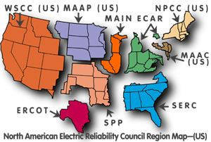 In terms of blackouts, there are just three regions. WSCC is one, ERCOT is another. All of the rest are interconnected, so that if one goes down, all go down. It is called the Eastern Interconnection. Please Note: In September 1996 most of Florida became a separate NERC region, the Florida Reliability Coordinating Council (FRCC). For purposes of historical trend analysis we have included FRCC in SERC. |