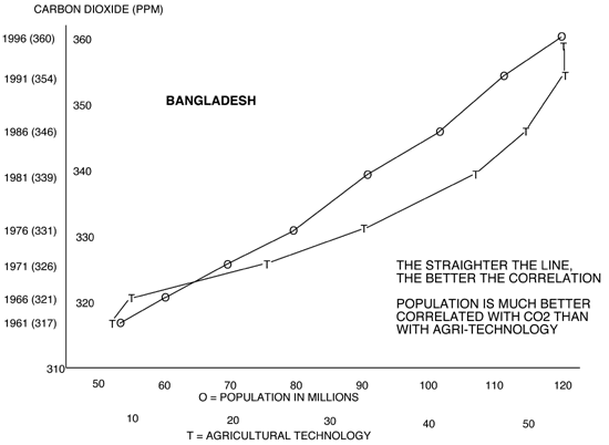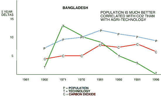 The 3 questions to be answered are these: 1. How much has the increase in carbon dioxide levels contributed to feeding the world so far, compared to the contribution of technology? 2. What is the increase in carbon dioxide levels likely to contribute in future? 3. How much of this benefit will be lost if the carbon dioxide increase is slowed or halted? In other words: What is the risk to global population growth and well being if we curb CO2 growth? The key fact is that world population has grown enormously and food production has kept pace with it. In 1975 the earth's population was 4 billion, today it is 6 billion. That's 2 billion more mouths to feed in just 25 years, and they are in fact fed. The UN's Food and Agriculture Organization's per capita food production indices vary with weather, natural disaster, and civil unrest, but they are basically constant. Production has increased 50% in 25 years. A miracle, the green miracle of global food (also shelter and clothing) increase. Moreover, population growth, while slowing, continues, so we must figure out how this green miracle has happened and keep it going. To the extent there is evidence that the CO2 increase is a significant contributor (the Greening Theory), we don't want to do anything to reduce that contribution, such as slowing or stopping the CO2 increase. The risk is potentially enormous, including starvation on a global scale. And there is abundant evidence that CO2 increase is one of, if not the chief, contributor to the green revolution -- theory, experiment, and observation all concur. First off, there is a very strong correlation between CO2 levels and crop production. Correlation is not causation, to equate them is the post hoc fallacy. But we have both a correlation and a mechanism, which is a strong argument for causation. CO2 is the food of plants so it seems natural that if the mass of available food increases the mass of plants should too. That this is true for total global plant mass is now confirmed by several so-called "sink studies". What is true for total mass should be true for crops, especially since we are going to such great lengths to remove the other possible limiters to growth, such as water, nutrients and pests. Back to the correlation. That it should be a coincidence is virtually impossible, since the standard deviation is very low. The third alternative is that both CO2 increases and crop increases have a common cause. The likely candidates are technology, or population per se, or both. Any assessment of this must begin with the fact that some of the poorest countries have sustained the greatest population growth. They are generally feeding themselves, because they cannot buy a lot of imports. Then one expects to also find that technology alone cannot explain this fact. For precisely the same reason -- they cannot afford it and so have not availed themselves of it to a degree sufficient to explain the increased production. Analytically this amounts to showing that there is not a correlation between intensity of technology and increased production. This is the heart of the study. First passes over the data show this to be true, but some arduous analysis remains to be done. The key to this analysis will be figuring out ways to accurately estimate the impact of each technology. For example, some countries with large population growth have seen large growth in irrigation, but others have seen very little. Likewise for the use of fertilizer, mechanization, etc. Sorting out the relative contributions of technology versus the greening effect, as well as among specific technologies, will not be easy, but it should be possible. Until it is done we cannot know the risk associated with curbing the CO2 increase. The USDA should lead Greening Research, but it is doing nothing. Absent technology, simply throwing more people at the same land can increase production only so much, but that is the last hypothesis to be exhausted. If that can be disproved then only the CO2 increase per se is left. In a way it is simple, which is good. We know that CO2 has increased, and that food production has increased as well. Is there a causal connection? Given that theory, experiment and observation concur there is probably only one reasonable conclusion. The green revolution is to a significant degree the greening effect. Since the green revolution is one we desperately want to continue, the cost (or lost benefits) of cutting CO2 growth might well be a global population disaster. The magnitude of this risk needs to be carefully assessed before action is taken. Anyone wishing to pursue this analysis will do well to start with FAOSTAT.This is an extensive online database maintained by the UN Food and Agriculture Organization. It provides annual data on a host of measures, generally from 1961 to the present. Measures are for individual countries and numerous regions, plus other combinations of countries. They include production of various crops, and population, plus many measures of technological inputs, such as irrigation, mechanization fertilizer and others. Many measures are provided both in absolute terms and as per capita indices. The data can be cut in millions of ways online. To download the results requires a subscription, but one may be able to copy tables from the screen and paste into a spreadsheet. The FAOSTAT Statistical Database contains over 1 million time series records covering over 210 countries and territories and 3,000 items in the areas of Agriculture, Fisheries, Forestry and Nutrition. Example: The two diagrams below present FAOSTAT data for Bangladesh from 1961 to 1996, in five year increments. The upper chart is called a scatter diagram. It plots CO2 levels against population. The result is very nearly a straight line, which indicates a high statistical correlation. Technological input is also plotted. It does not correlate well with population, in fact technological development drops off to nothing in the 1