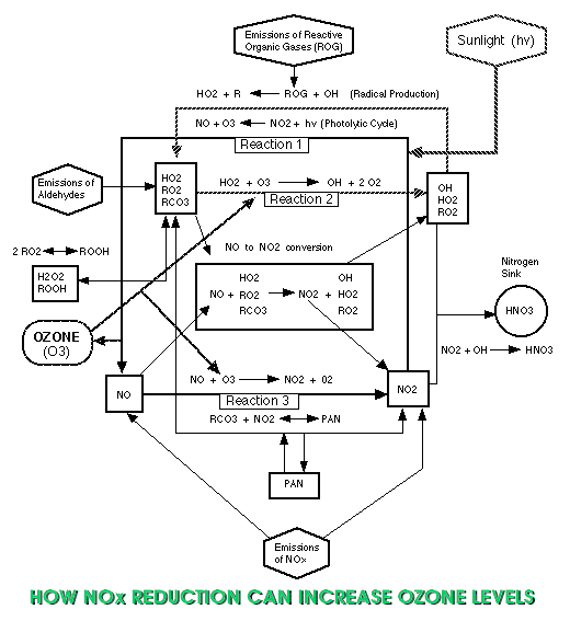 Note the reactions labeled 1, 2 and 3 in the diagram. All three of these reactions occur at all times during daylight hours. Reaction 1 which is driven by sunlight creates ozone, while reactions 2 and 3 consume ozone. Reaction 3 depends on NOx to do its job. In certain cases if NOx levels are reduced less ozone is consumed by reaction 3, and reaction 1 drives ozone levels higher. These higher levels of ozone are called the "disbenefits"of NOx reduction.